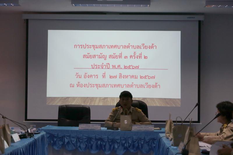 รายละเอียด : วันที่ 27 สิงหาคม 2567 เทศบาลตำบลเวียงต้า ดำเนินการประชุมสภาเทศบาล สมัยสามัญ สมัยที่ 3 ครั้งที่ 2 ประจำปี พ.ศ. 2567 มีวาระการประชุมที่สำคัญเพื่อการพิจารณาร่างเทศบัญญัติ งบประมาณรายจ่ายประจำปีงบประมาณ พ.ศ. 2568 วาระที่ 3 การพิจารณาให้ความเห็นชอบในการตราเป็นเทศบัญญัติ การพิจารณาขออนุมัติโอนงบประมาณรายจ่ายประจำปีงบประมาณรายจ่าย พ.ศ. 2567 เพื่อตั้งเป็นรายการใหม่ สำนักปลัด 1 รายการ และการพิจารณาขออนุมัติโอนงบประมาณรายจ่ายประจำปีงบประมาณรายจ่าย พ.ศ. 2567 เพื่อตั้งเป็นรายการใหม่ งบลงทุน หมวดค่าที่ดินและสิ่งก่อสร้าง กองช่าง 1 โครงการ โดยมีนายธวัชชัย กันทะวงศ์ รองประธานสภาเทศบาล เป็นประธานในการประชุม ว่าที่ร้อยตรีปรเมศ อินโองการ หัวหน้าสำนักปลัดเทศบาล รักษาราชการแทนปลัดเทศบาล เป็นเลขานุการการประชุม มีคณะผู้บริหาร นำโดยนายประภาส โพธิตา นายกเทศมนตรี พนักงานเทศบาล และผู้นำชุมชน เข้าร่วมประชุม ณ ห้องประชุมสภาเทศบาล
