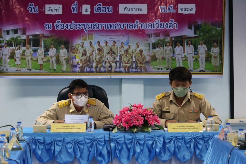 รายละเอียด : วันที่ 5 กันยายน 2565 เทศบาลตำบลเวียงต้า ดำเนินการประชุมสภาเทศบาลสมัยสามัญ สมัยที่ 3 ครั้งที่ 3 โดยมีวาระการประชุมเรื่องแจ้งจากประธานสภาเทศบาล แนะนำพนักงานเทศบาลย้ายมาปฏิบัติราชการในเทศบาลตำบลเวียงต้า 1 ท่าน คือนายสายสุมิตร มาบุญมี ตำแหน่งปลัดเทศบาล เรื่องค้างเพื่อการพิจารณาการขอใช้พื้นที่ป่าเพื่อประกอบกิจกรรมทางพุทธศาสนาวัดหัวฝาย หมู่ที่ 7 โดยพระสมุห์พันธ์ธวัช โชติรวิวังโส เจ้าอาวาสวัดหัวฝายเข้าชี้แจงเพื่อการพิจารณา และเรื่องเพื่อการพิจารณาการลาออกจากตำแหน่งเลขานุการสภาเทศบาลตำบลเวียงต้า การพิจารณาขออนุมัติโอนเงินงบประมาณรายจ่ายไปตั้งเป็นรายการใหม่กองคลัง 1 รายการ และการพิจารณาขออนุมัติกันเงินงบประมาณประจำปีงบประมาณ พ.ศ.2564 และงบประมาณประจำปี งบประมาณ พ.ศ.2565 โครงการที่ยังไม่ได้ก่อหนี้ผูกพัน จำนวน 16 โครงการ ในการประชุมมี นายเฉลียว ลำทา ประธานสภาเทศบาลเป็นประธานการประชุม นางสาวเอมอร กองโกย หัวหน้าสำนักปลัดเทศบาล รักษาราชการแทนปลัดเทศบาล เป็นเลขานุการสภาเทศบาล และมีคณะผู้บริหาร นำโดย นายประภาส โพธิตา นายกเทศมนตรี และผู้อำนวยการกองช่าง กองคลัง กองการศึกษา พนักงานเทศบาล เข้าร่วมประชุม ณ ห้องประชุมสภาเทศบาล