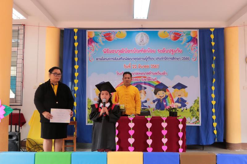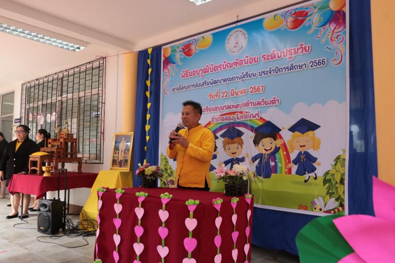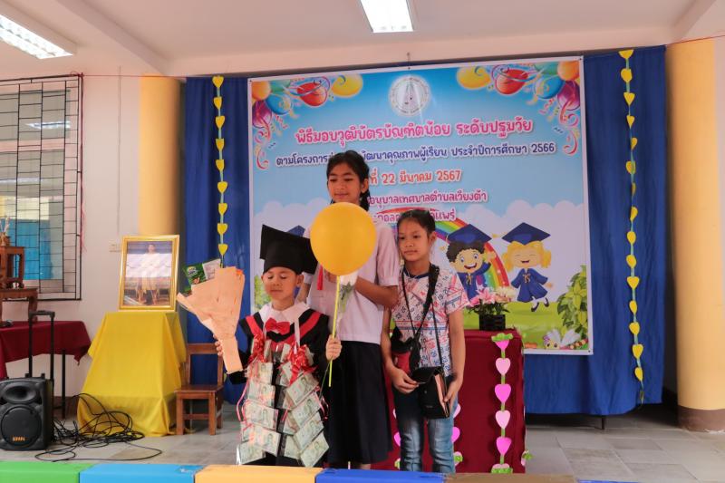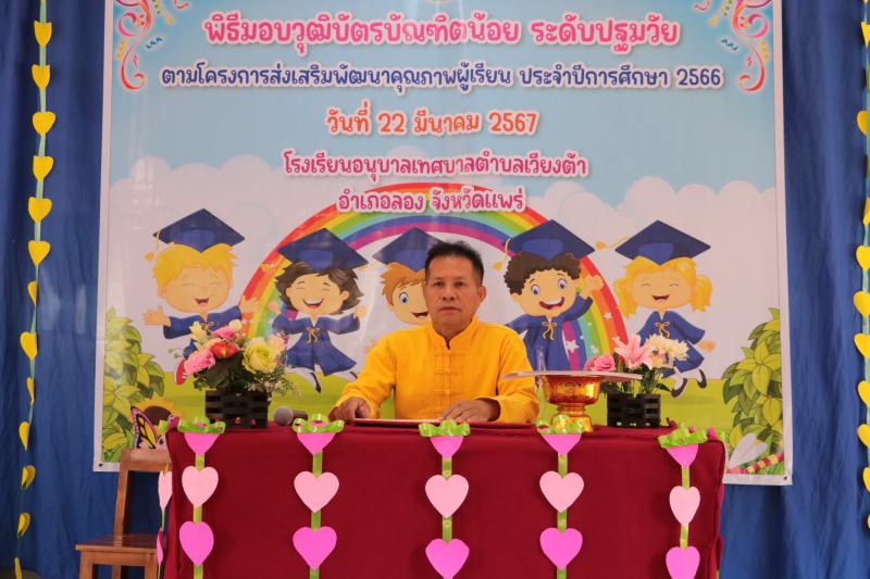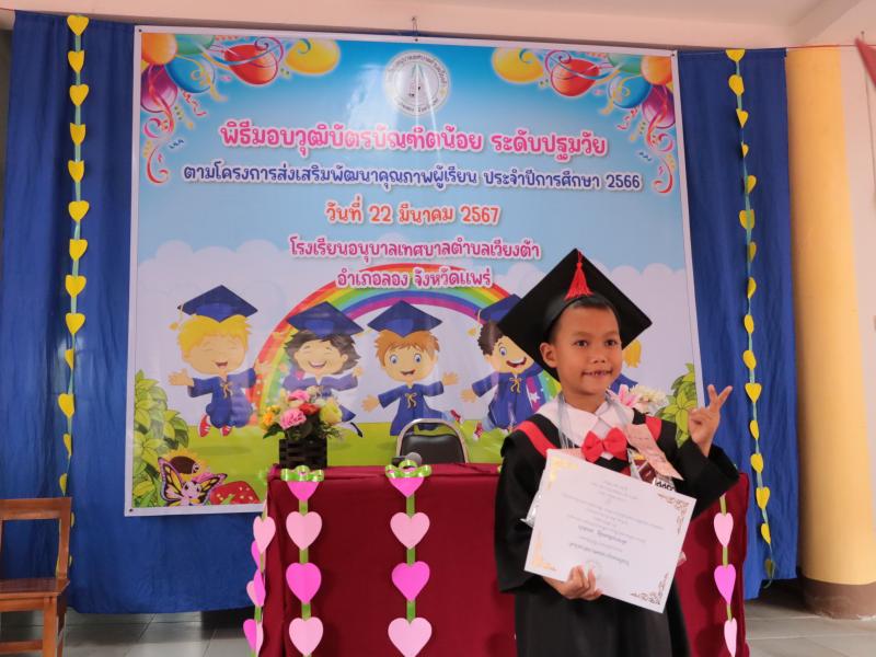 รายละเอียด : วันที่ 22 มีนาคม 2567 โรงเรียนอนุบาลเทศบาลตำบลเวียงต้า จัดพิธีมอบวุฒิบัตรบัณฑิตน้อย ระดับปฐมวัย ตามโครงการส่งเสริมพัฒนาคุณภาพผู้เรียน ประจำปีการศึกษา 2566 โดยมีนายประภาส โพธิตา นายกเทศมนตรี เป็นประธานในพิธี มีนักเรียนสำเร็จการศึกษา ระดับชั้นอนุบาล 3 จำนวน 34 คน การจัดกิจกรรมมอบวุฒิบัตรให้กับบัณฑิตน้อย เป็นการสร้างแรงจูงใจให้นักเรียนได้เกิดความภาคภูมิใจในความสำเร็จของการเรียน การจัดกิจกรรมมีการแสดงของนักเรียน และตัวแทนนักเรียนที่จบระดับชั้นอนุบาล 3 ได้กล่าวขอบคุณ คณะครูผู้สอน คณะผู้บริหาร และผู้ปกครอง ที่ได้สั่งสอนอบรมให้เป็นเด็กดี และสนับสนุนให้มีโอกาสได้เรียนที่ดียิ่งขึ้นไป โดยมีคณะผู้บริหาร และผู้ปกครองนักเรียนเข้าร่วมในพิธีด้วยความชื่นชมยินดีและภาคภูมิใจในตัวนักเรียนเป็นอย่างยิ่ง ณ โรงเรียนอนุบาลเทศบาลตำบลเวียงต้า