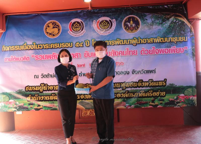 รายละเอียด : วันที่ 27 มกราคม 2565 เวลา 08.30 น. นายประภาส โพธิตา นายกเทศมนตรีตำบลเวียงต้า พร้อมด้วยคณะผู้บริหาร ร่วมกิจกรรมเนื่องในวาระครบรอบ 54 ปี โครงการพัฒนาผู้นำอาสาพัฒนาชุมชน ภายใต้แนวคิด “รวมพลังจิตอาสา ขับเคลื่อนสังคมไทย ด้วยใจพอเพียง ซึ่งสำนักงานพัฒนาชุมชนจังหวัดแพร่ จัดขึ้น ณ วัดต้าม่อน หมู่ที่ 3 ตำบลเวียงต้า โดยมี นายชุติเดช มีจันทร์ ผู้ว่าราชการจังหวัดแพร่ เป็นประธานเปิดงาน อ่านสารรัฐมนตรีว่าการกระทรวงมหาดไทย (พลเอกอนุพงษ์ เผ่าจินดา) มอบประกาศเกียรติคุณแก่อาสาพัฒนาชุมชน (อช.) และ ผู้นำอาสาพัฒนาชุมชน ที่มีผลงานดีเด่น ประจำปี 2565 มอบเครื่องอุปโภคบริโภค ให้แก่ผู้ยากไร้ ปลูกต้นยมหินต้นไม้ประจำจังหวัดแพร่ บริเวณในวัด และเยี่ยมชมการจัดจำหน่ายผลิตภัณฑ์สินค้าชุมชนของแต่ละอำเภอในการจัดกิจกรรมมี พระครูประโชติวีรธรรม เจ้าอาวาสวัดต้าม่อน พระครูโสภณปัญญาธร รองเจ้าอาวาสวัดเชตวัน ตำบลหัวทุ่ง นายกิตติชัช บุตรศรี นายอำเภอลอง หัวหน้าหน่วยงานในจังหวัดแพร่ พัฒนาการอำเภอ พัฒนาชุมชน ผู้นำอาสาพัฒนาขุมชน 8 อำเภอ และ ผู้นำชุมชน ประชาชนในตำบลเวียงต้า ร่วมในพิธี