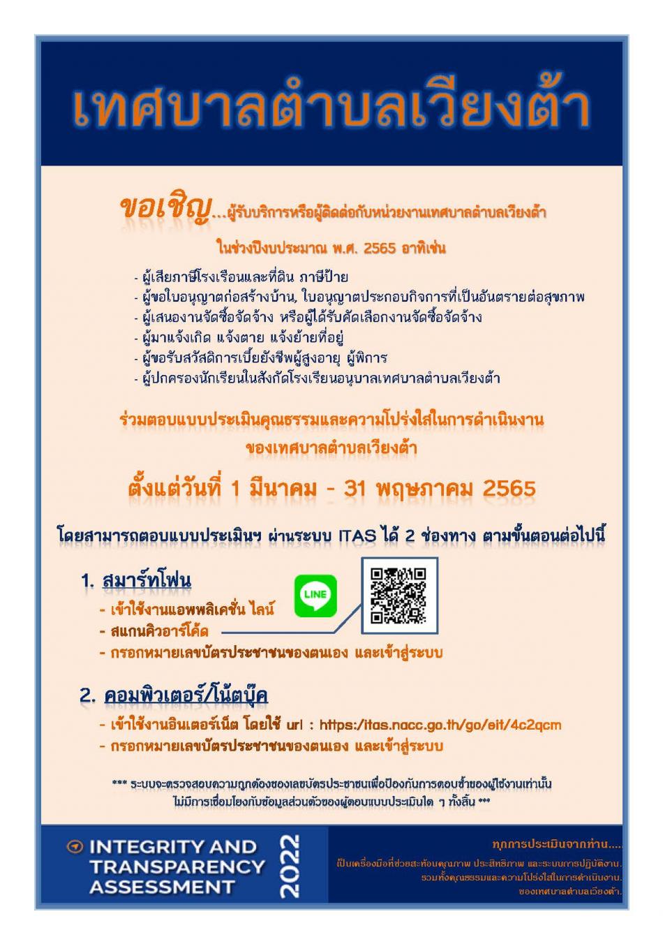 ขอเชฺิญร่วมตอบแบบประเมินคุณธรรมและความโปร่งใสในการดำเนินงาน ของเทศบาลตำบลเวียงต้า ประจำปีงบประมาณ พ.ศ. 2565 [9 มีนาคม 2565]