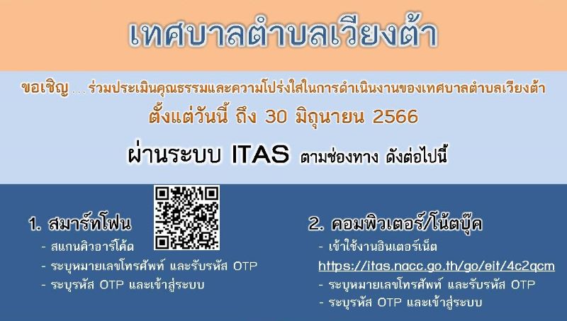 ขอเชฺิญร่วมประเมินคุณธรรมและความโปร่งใสในการดำเนินงาน ของเทศบาลตำบลเวียงต้า ประจำปีงบประมาณ พ.ศ. 2566